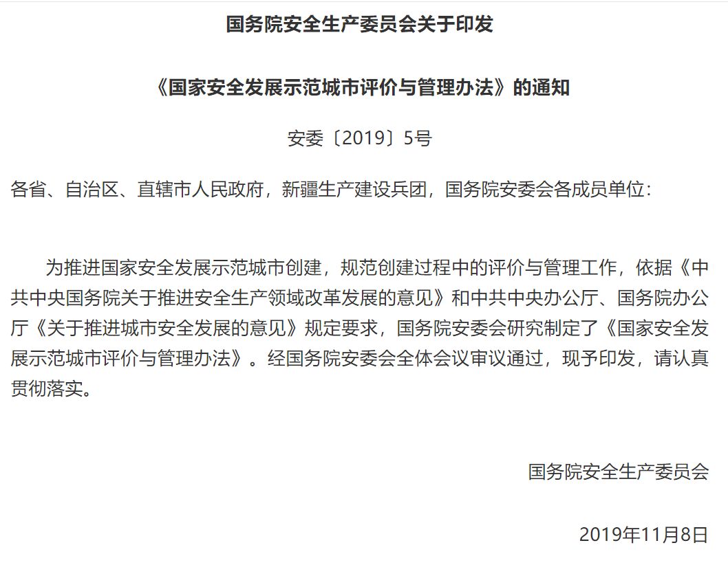 為推進(jìn)國家安全發(fā)展示范城市創(chuàng)建,規(guī)范創(chuàng)建過程中的評價(jià)與管理工作,11月8日,國務(wù)院安全生產(chǎn)委員會(huì),向各省、自治區(qū)、直轄市人民政府,新疆生產(chǎn)建設(shè)兵團(tuán),國務(wù)院安委會(huì)各成員單位印發(fā)了《國家安全發(fā)展示范城市評價(jià)與管理辦法》(以下簡稱“評價(jià)辦法”)的通知。