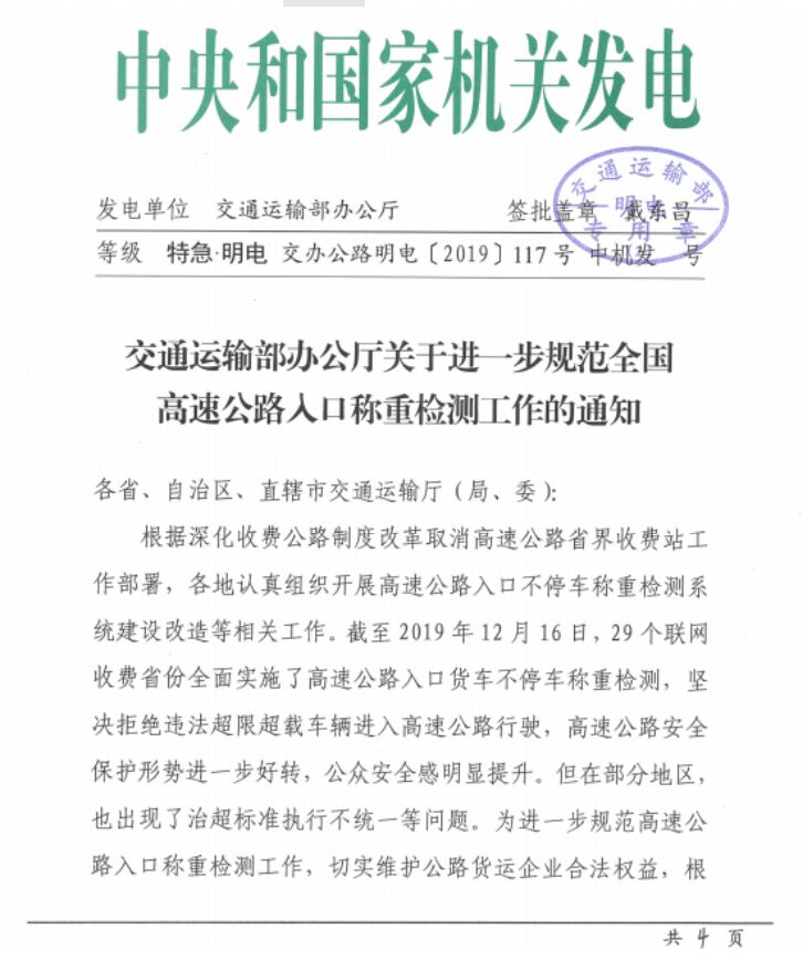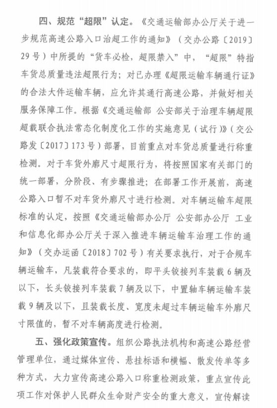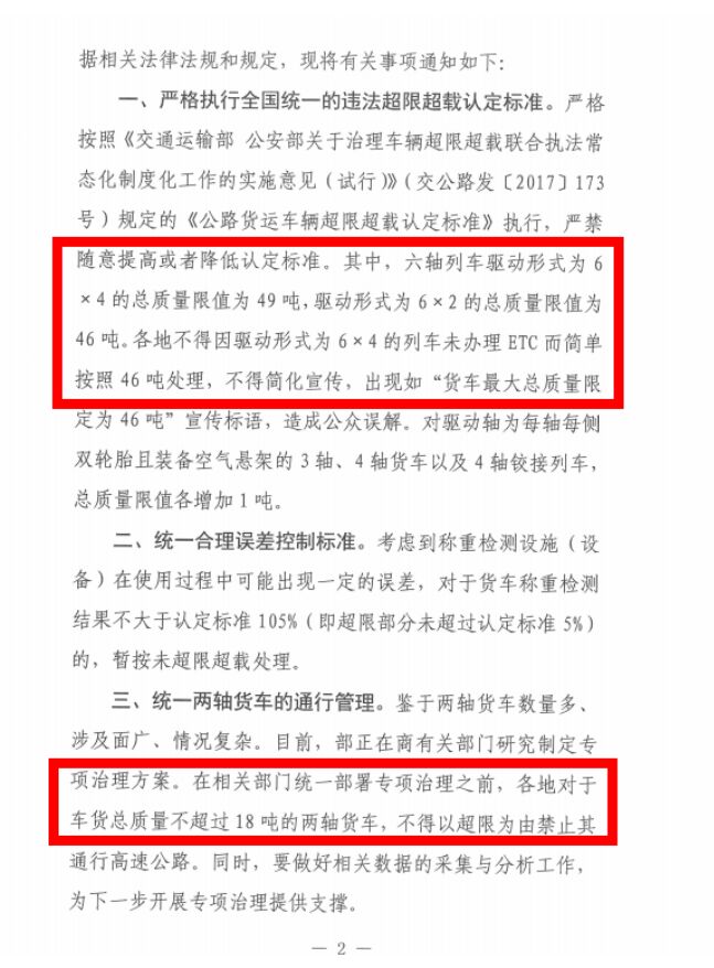 為進一步相應(yīng)國家關(guān)于收費公路制度改革取消高速公路省界收費站工作部署,近日,交通運輸部發(fā)文《交通運輸部辦公廳為進一步規(guī)范全國高速公路入口稱重檢測工作的通知》(以下簡稱“通知”),該通知重點強調(diào)了全國統(tǒng)一的違法超限超載認(rèn)定執(zhí)行標(biāo)準(zhǔn),并進一步明確“六軸列車驅(qū)動形式為6*4的總質(zhì)量限值為49噸,驅(qū)動形式為6*2的總質(zhì)量限值為46噸。各地不得因驅(qū)動形式為6*4的列車未辦理ETC而簡單按照46噸處理,不得簡化宣傳,出現(xiàn)如“貨車最大總質(zhì)量限定為46噸”宣傳標(biāo)語,造成公眾誤解。”;同時還要求,各地對于車貨總重不超過18噸的兩軸貨車,不得以超限為由禁止其通行高速公路。