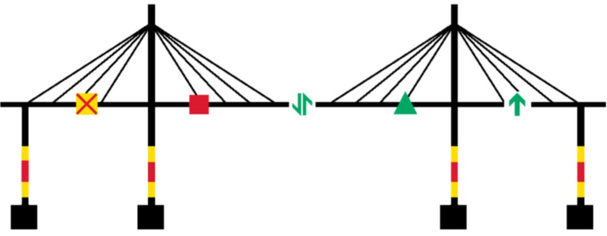 在國標《中國海區(qū)可航行水域橋梁助航標志》(GB24118-2009)中列出了兩種類型的通航橋孔:雙向通航橋孔和單向通航橋孔,并根據(jù)不同的通航橋孔給出了對應(yīng)的設(shè)置標準。