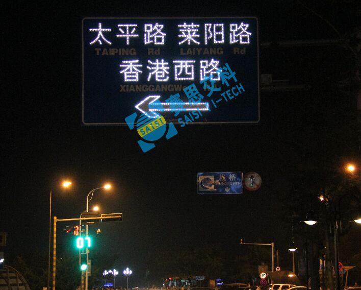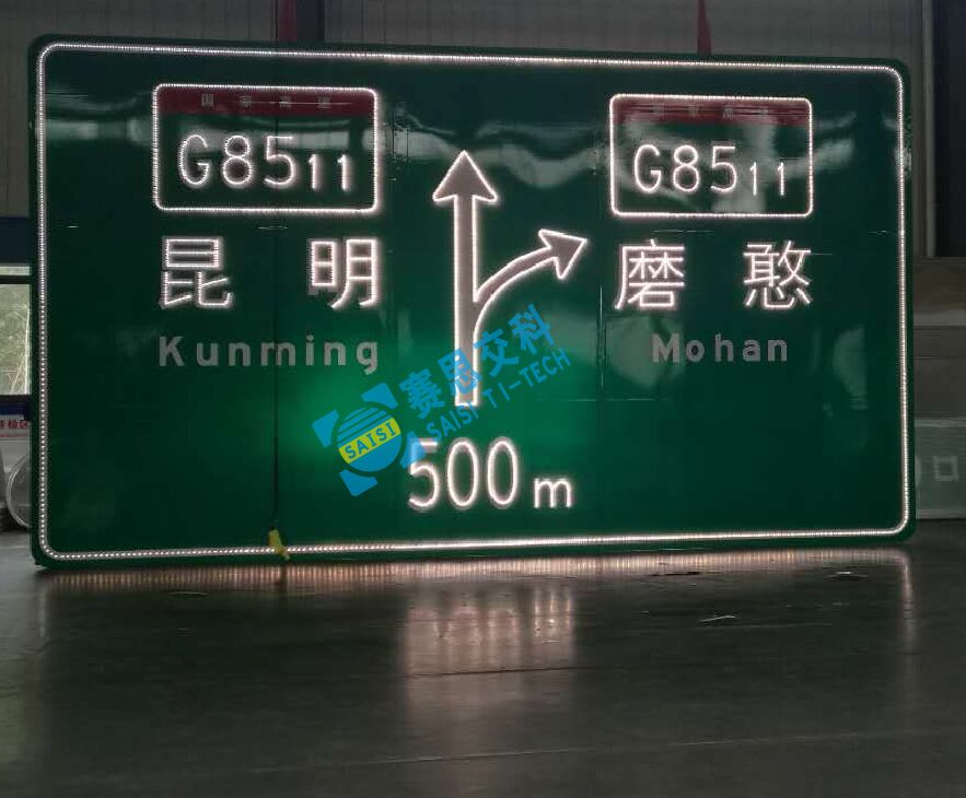 “大型指路類點陣型主動發(fā)光標志”,其標志版面中圖案、文字、數(shù)字、字母、邊線等外嵌高亮LED發(fā)光管,并通過調(diào)光測試軟件,將LED發(fā)光管合理布點,并設(shè)置合理的發(fā)光強度,形成由點光源組成的面光源視認效果,實現(xiàn)標志牌能主動發(fā)光的功能特性,滿足人眼正常、和諧的視覺捕捉及視認效果。