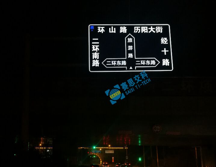 指路標(biāo)志,作為道路路名、關(guān)鍵交通節(jié)點的重要指示信息載體,通常設(shè)置于道路交叉口進(jìn)口方向,對前方交叉口的相交路名信息、遠(yuǎn)點信息進(jìn)行提前的預(yù)告,便于司機(jī)及時獲取關(guān)聯(lián)道路信息,及時修正駕駛方向,實現(xiàn)準(zhǔn)確達(dá)到目的地的行車目標(biāo)。所以指路標(biāo)志具備遠(yuǎn)距離辨認(rèn)性、全天候視認(rèn)性、和在交叉口易發(fā)現(xiàn)性顯得尤其重要,設(shè)計師在選用半透式主動發(fā)光標(biāo)志,正是出于以上的特殊功能性。