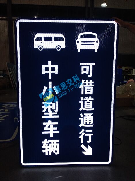 指示標(biāo)志,通常包括:路名(地點)確認(rèn)標(biāo)志、道路功能指示標(biāo)志(如:車道行駛標(biāo)志)、道路屬性標(biāo)志(如:非機(jī)動車道標(biāo)志)、行駛方向指示標(biāo)志(如:右下行駛標(biāo)志)等。該類標(biāo)志通常版面尺寸較小,但所載信息重要關(guān)鍵。在城市道路中,到處充斥著各種廣告標(biāo)志、宣傳標(biāo)志、店名標(biāo)志等,指示標(biāo)志在其中,常常不易被發(fā)現(xiàn),運用半透式主動發(fā)光標(biāo)志,使該類標(biāo)志主動發(fā)光,在夜晚或光照不佳的環(huán)境中,能主動發(fā)光標(biāo)志,極易被捕捉發(fā)現(xiàn),這是交通安全設(shè)計師非常看重的特殊化功能優(yōu)勢。