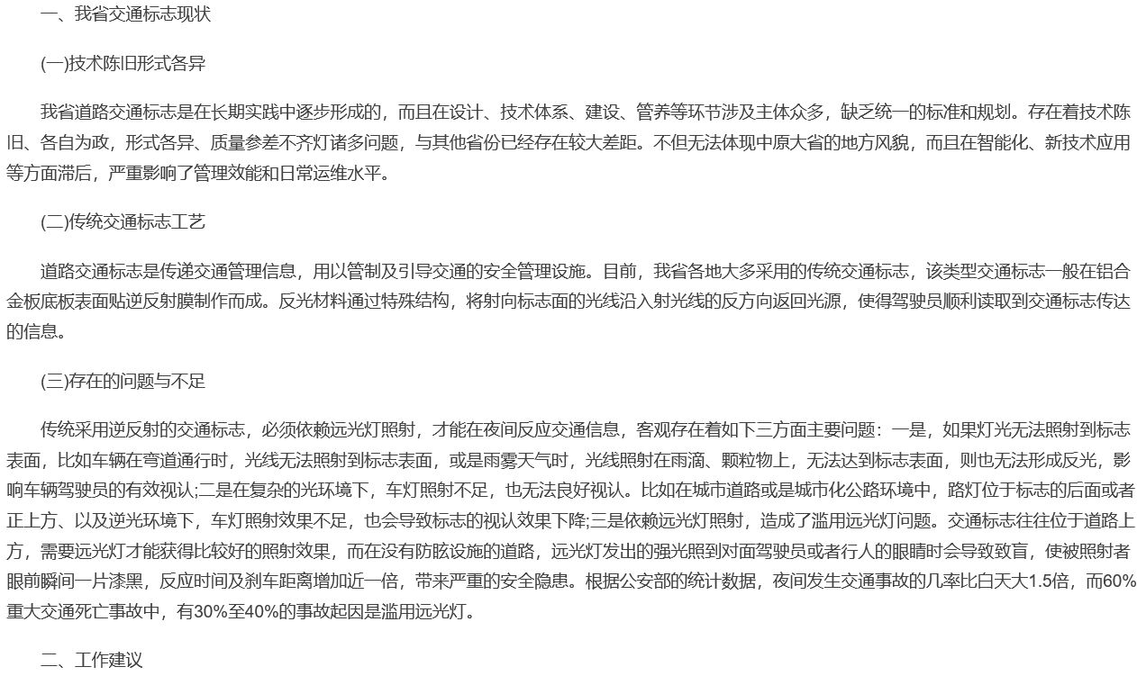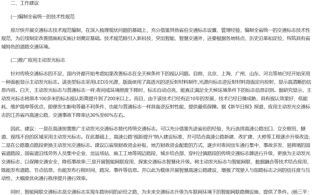 主動(dòng)發(fā)光標(biāo)志,因其具備獨(dú)特的功能優(yōu)勢,主要有:(1)能主動(dòng)發(fā)光,不需依賴汽車遠(yuǎn)光燈照射;(2)提升標(biāo)志的遠(yuǎn)距離視認(rèn)性;(3)增強(qiáng)標(biāo)志的易捕捉性和警示性;(4)增強(qiáng)標(biāo)志在雨、霧、冰、雪、霾、逆光等惡劣交通環(huán)境中,仍能保持良好的顯示效果。上述功能能彌補(bǔ)在特殊交通環(huán)境中普通逆反射標(biāo)志的功能不足現(xiàn)象。為此,文中還給出相關(guān)建議:“一是在高速按需推廣主動(dòng)發(fā)光交通標(biāo)志替代傳統(tǒng)交通標(biāo)志??梢猿浞纸梃b先進(jìn)省份的經(jīng)驗(yàn),先行選擇高速公路出口、立交樞紐、隧道、視線不良的區(qū)域采用主動(dòng)發(fā)光標(biāo)志。在此基礎(chǔ)上,高速公路“視距提升”納入建設(shè)標(biāo)準(zhǔn),并可結(jié)合高速公路新建、改擴(kuò)建、大修等工程逐步升級改造;二是在公路重點(diǎn)路段更換主動(dòng)發(fā)光交通標(biāo)志。建議以省級財(cái)政資金補(bǔ)貼,地方財(cái)政資金配套的方式,逐步對夜間貨車通行集中、事故多發(fā)、易擁堵的國省道路段,國省道沿線勞務(wù)人員集中企業(yè)、貨運(yùn)場站、施工工地等周邊路段,城鄉(xiāng)結(jié)合部、穿村過鎮(zhèn)路段的傳統(tǒng)交通標(biāo)志牌進(jìn)行升級,更換為主動(dòng)發(fā)光交通標(biāo)志,以保障交通安全,降低事故率;三是開展智能網(wǎng)聯(lián)應(yīng)用,探索交通標(biāo)志智慧化升級。將主動(dòng)發(fā)光標(biāo)志與智能網(wǎng)聯(lián)、數(shù)據(jù)融合等技術(shù)結(jié)合應(yīng)用,既能發(fā)布道路、節(jié)點(diǎn)信息,也能發(fā)布行程時(shí)間、路況、事件等信息。并以此為載體開展智慧高速公路建設(shè),增強(qiáng)了駕駛?cè)伺c指路標(biāo)志之間的信任度與互動(dòng)性,大幅度優(yōu)化通行秩序提升通行效率?!?br />