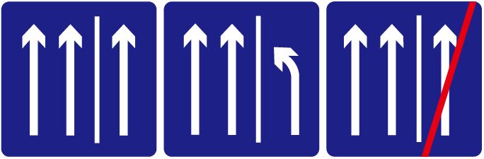 說明:表示該處硬路肩允許車輛通行,上左圖設(shè)置于起點;上中圖設(shè)置于即將結(jié)束處,提示盡快合流;上右圖設(shè)置于終點處。