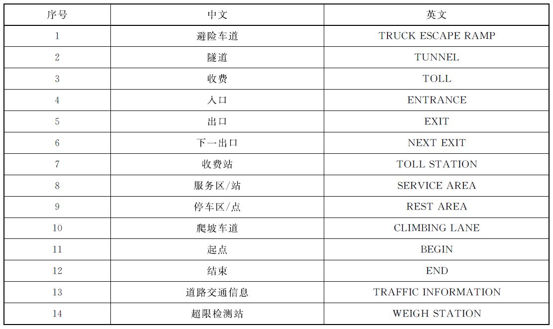 3、如采用英文專用名詞,宜全部大寫。如:安全出口,為“EXIT”;又如收費(fèi),為“TOLL”,《交通標(biāo)志專用名詞中英文對(duì)照表》詳見下表所示: