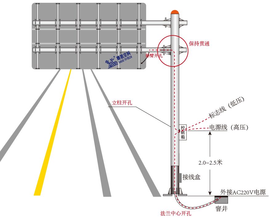 (3)安裝凈空安全。主動發(fā)光標志的安裝凈空應滿足《道路交通標志和標線》之道路交通標志(GB5768.2-2022)的技術(shù)要求,通常,懸臂類大型標志,其凈空不得小于5.0米,以防車輛刮蹭;路側(cè)小型標志,其凈空不得小于2.2米,以防行人碰頭。因特殊原因,需入侵建筑界限內(nèi)的標志設施,應當配置必要的反光、發(fā)光警示設施,加強遠距離警示。