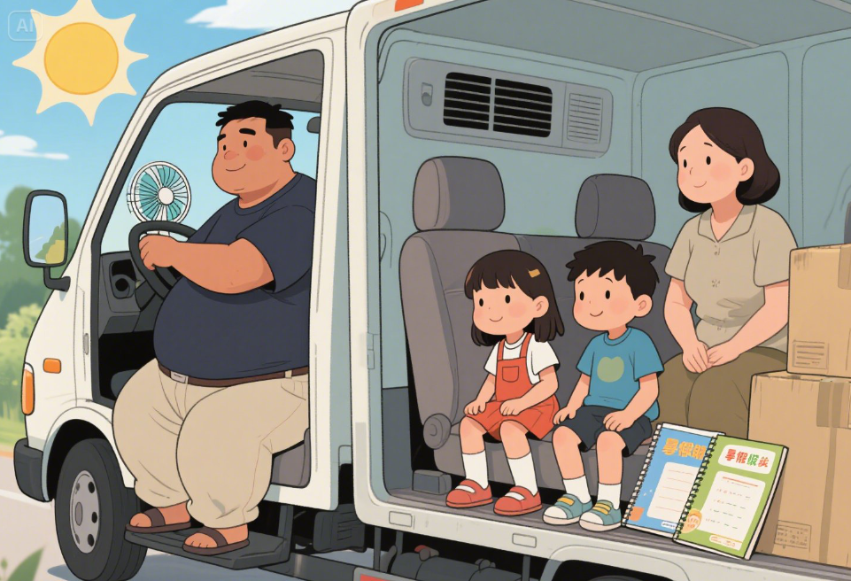 女人擰了一個(gè)濕毛巾,爬上后座位。這時(shí)我才發(fā)現(xiàn),風(fēng)扇下面的后座位上還躺著司機(jī)的一對(duì)兒女,女孩稍大點(diǎn),也都是小學(xué)生的年紀(jì),兩本暑假作業(yè)放在案頭,一排康師傅方便面和一編織袋的蘋果堆在旁邊。